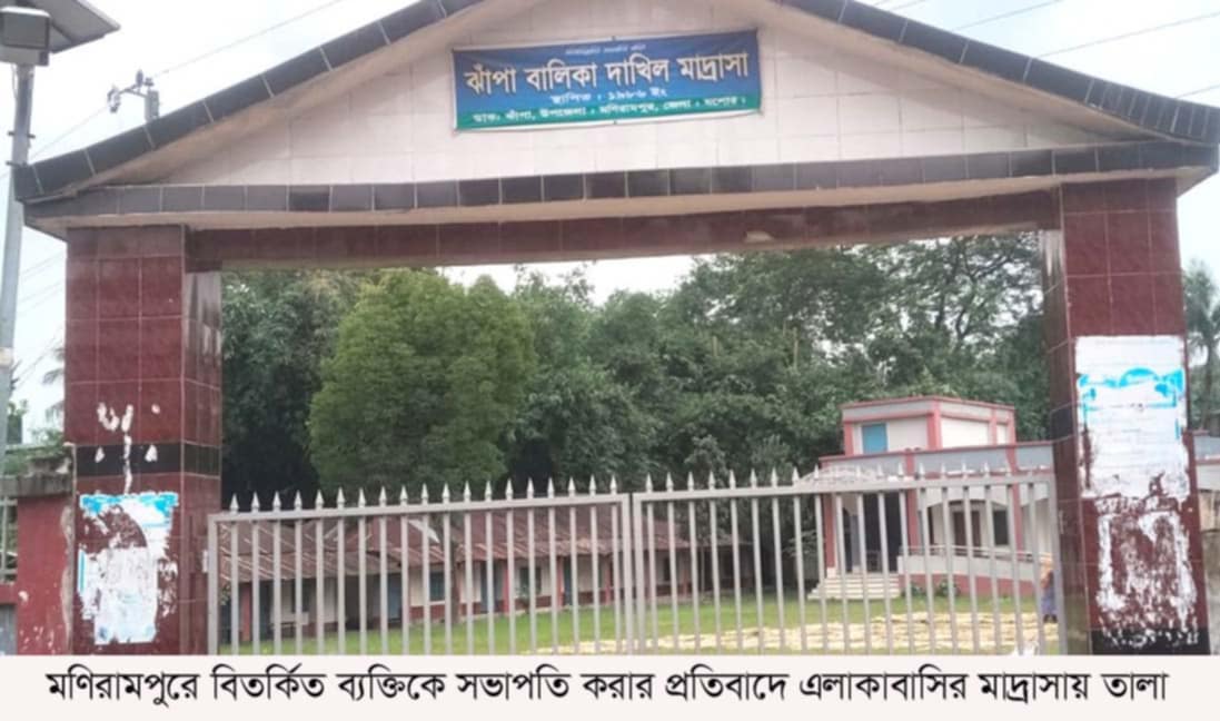 মণিরামপুরের রাজগঞ্জ এলাকার আসাদুজ্জামান মিন্টু নামে এক বিতর্কিত ব্যক্তিকে ঝাঁপা মহিলা দাখিল মাদ্রাসার এডহক কমিটির সভাপতি করায় সুপার শাহাদাত হোসেন এলাকাবাসীর তোপের মুখে পড়েছেন। অভিযোগ রয়েছে স্থানীয় অভিভাবক এবং শিক্ষকদের মতামত উপেক্ষা করে সুপার তার পছন্দের বিতর্কিত ব্যক্তিকে সভাপতি করেন।আর এ খবর জানাজানি হবার পর গতকাল সোমবার সকালে অভিভাবকসহ এলাকাবাসী মাদ্রাসা ঘেরাও করে প্রধান ফটকে তালা দেন। ফলে মাদ্রাসায় কোন ক্লাশ হয়নি।