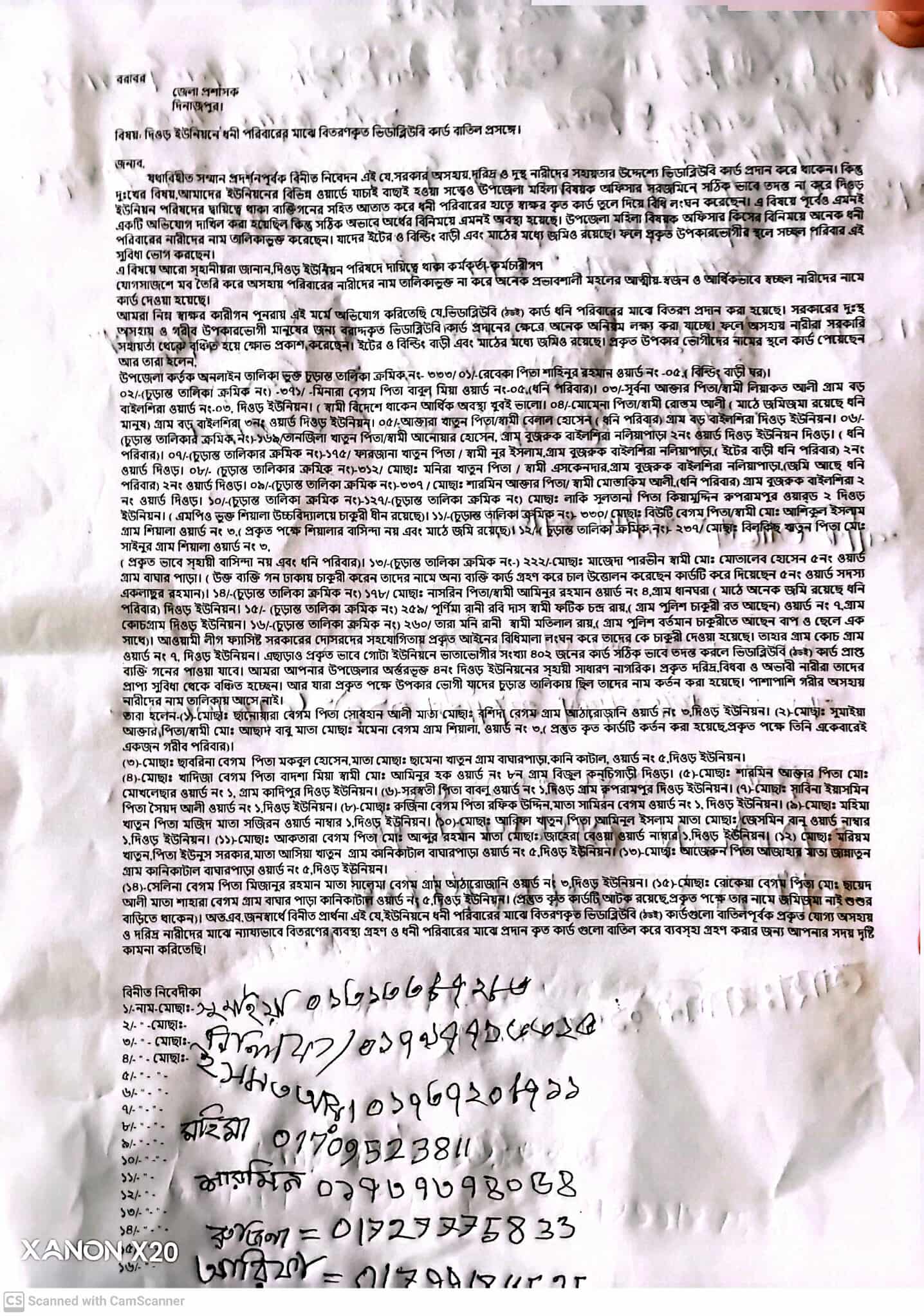 উপজেলা নির্বাহী অফিসার বরাবর অভিযোগ পত্র থেকে জানা যায়,সরকার অসহায়,দরিদ্র ও দুস্থ নারীদের সহায়তার উদ্দেশ্যে ভিডাব্লিউবি (VWB) কার্ড প্রদান করে থাকেন।