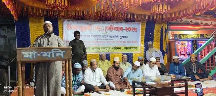 খায়রুল ইসলাম পাইকগাছা খুলনা প্রতিনিধি:- পাইকগাছায় সিরাতুন্নবী (সা.) ২০২৫ উদযাপন উপলক্ষ্যে অনুষ্ঠিত হয়েছে সিরাত সেমিনার ও সাংস্কৃতিক অনুষ্ঠান। বৃহস্পতিবার সন্ধ্যায় পাইকগাছা পৌরসভা চত্ত্বরে এ অনুষ্ঠানের আয়োজন করেন ইসলামী সমাজ কল্যাণ পরিষদ পাইকগাছা উপজেলা শাখা।এটি এই কমিটির প্রথম প্রতিষ্ঠাবার্ষিকী।প্রধান অতিথি ছিলেন, হাফেজ মাওলানা আসাদুজ্জামান আসাদ। প্রধান বক্তা ছিলেন, হাফেজ মাওলানা আব্দুর রহিম জামালি। বিশেষ আলোচক ছিলেন, আলহাজ্ব মাও. আবুল কাশেম গোলামুল্যাহ, মাও. আফছার উদ্দিন ফিরোজ, হাফেজ মাও.আব্দুল হান্নান ওমর, মাও. আব্দুল কাদির। সভাপতিত্ব করেন,পাইকগাছা শাখা কমিটির সভাপতি হা. মাও. নুরে আলম সিদ্দিকী।