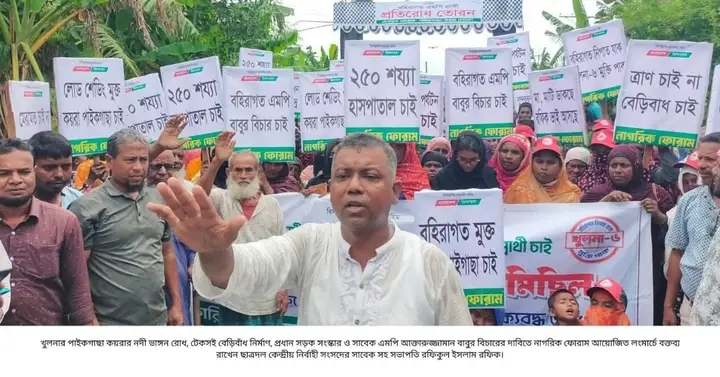 শেখ খায়রুল ইসলাম পাইকগাছা (খুলনা) প্রতিনিধি:- খুলনা-৬ (পাইকগাছা-কয়রা) আসনে বহিরাগত এমপি প্রার্থী প্রতিরোধ, ১৮ মাইল হতে কয়রা উপজেলা পর্যন্ত ভাঙাচুরো সড়ক মেরামত,টেকসই ভেড়িবাঁধ নির্মান,সুন্দরবন জেলা ও কয়রায় পর্যটন কেন্দ্রসহ নানা দাবিতে মিছিল ও মানববন্ধন কর্মসূচি পালিত হয়েছে।৩০শে আগস্ট শুক্রবার তালা-পাইকগাছা উপজেলা সিমান্ত কপিলমুনির কাশিমনগর শাপলা চত্বরে নাগরিক ফোরাম আয়োজিত কর্মসূচিতে এসব দাবি-দাওয়া উর্থাপন করা হয়।
