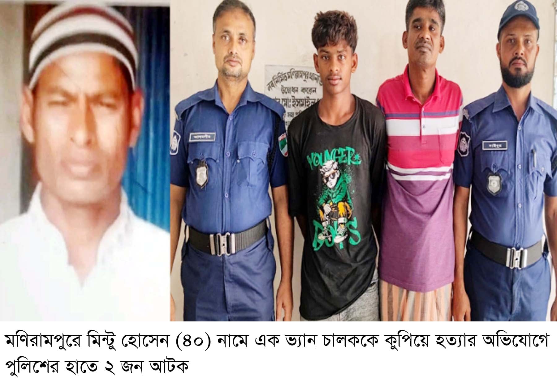 যশোরের মণিরামপুরে পাওনা ৫ হাজার টাকার জন্য মিন্টু হোসেন (৪০) নামে এক ভ্যানচালককে কুপিয়ে হত্যা। এ ঘটনায় একই পরিবারের আরও চারজনকে কুপিয়ে আহত করা হয়েছে। থানায় মামলা এবং মামলার আসামীকে পুলিশ আটক করেছে। ঘটনাটি ঘটে বৃহস্পতিবার সন্ধ্যায় পৌর এলাকার সরকারি বালক উচ্চ বিদ্যালয়ের দক্ষিণ পাশে একটি চায়ের দোকানে। শুক্রবার মধ্যরাতে ঢাকায় একটি হাসপাতালে চিকিৎসাধীন অবস্থায় মিন্টু হোসেনের মৃত্যু হয়। মিন্টু হাকোবা গ্রামের আব্দুল আজিজের ছেলে। হামলার শিকার নিহত মিন্টুর ২ ভাই সেন্টু, পিকুলসহ তাদের মা-বাবা চিকিৎসাধীন আছেন। তাদের মধ্যে সেন্টুর অবস্থা আশঙ্কাজনক বলে জানা গেছে।