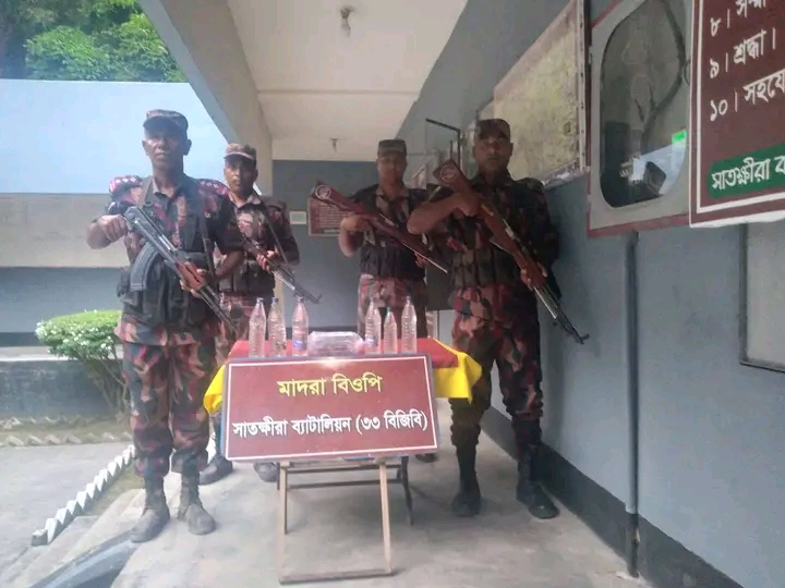 গোয়েন্দা তথ্যের ভিত্তিতে মাদরা বিওপির বিশেষ আভিযানিক দল সীমান্ত পিলার-১৩/৩ এস এর ১৪ আরবি হতে আনুমানিক ২০০ গজ বাংলাদেশের অভ্যন্তরে কলারোয়া থানাধীন চাঁন্দা আমবাগান নামক স্থান হতে ০৬ বোতল ভারতীয় মদ আটক করে।