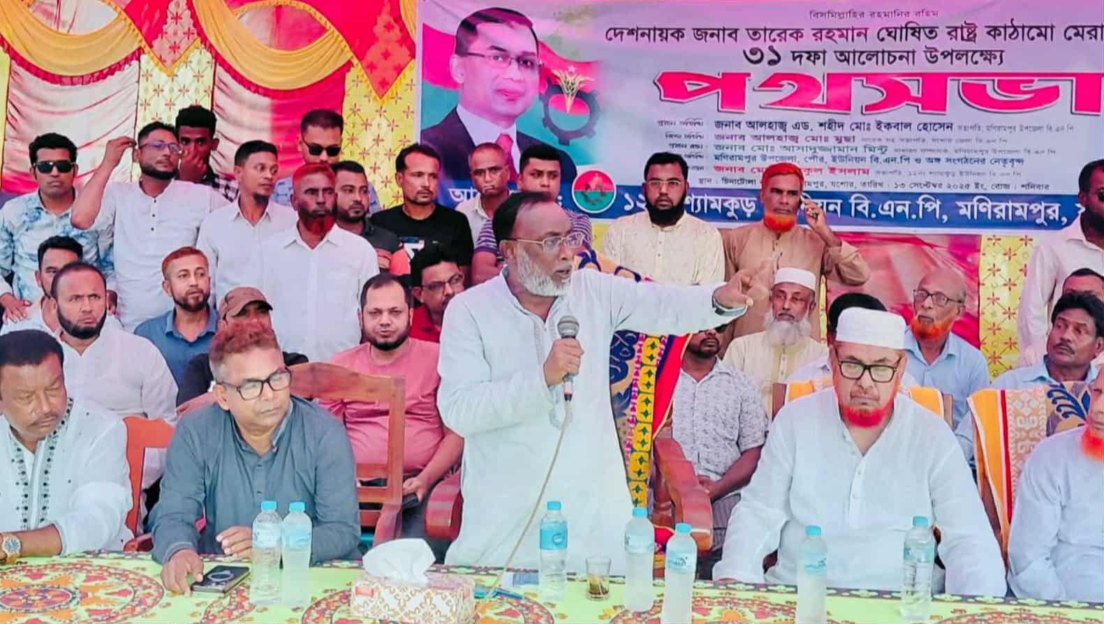 যশোরের মণিরামপুর উপজেলা বিএনপির দু’গ্রুপের সাংগঠনিক ঐক্যবদ্ধ পথসভা অনুষ্ঠিত হয়েছে। শনিবার বিকালে উপজেলার শ্যামকুড় ইউনিয়ন বিএনপির আয়োজনে চিনাটোলা বাজারের স্থানীয় সরকারী প্রাথমিক বিদ্যালয়ের মাঠে দেশনায়ক তারেক রহমান ঘোষিত রাষ্ট্র কাঠামো মেরামতের ৩১ দফা আলোচনা উপলক্ষে পথসভা অনুষ্ঠিত হয়। ওই পথসভায় ঐক্যবদ্ধ হয়ে মঞ্চে উঠেছেন দু’গ্রুপের নেতারা। যার কারনে তৃণমূলের নেতাকর্মীদের মধ্যে চাঙা ভাব সঞ্চার হয়ে ঐক্যবদ্ধ পথসভা নেতা-কর্মী ও সমর্থকের উপস্থিতিতে পরিনত হয় জনসভায়। সভায় প্রধান অতিথি হিসেবে বক্তব্য রাখেন উপজেলা বিএনপির সভাপতি সাবেক পৌর মেয়র অ্যাড. শহীদ ইকবাল হোসেন। বিশেষ অতিথির বক্তব্য রাখেন উপজেলা বিএনপির সাবেক সভাপতি মোহাম্মাদ মুছা ও বর্তমান সাধারন সম্পাদক আসাদুজ্জামান মিন্টু।