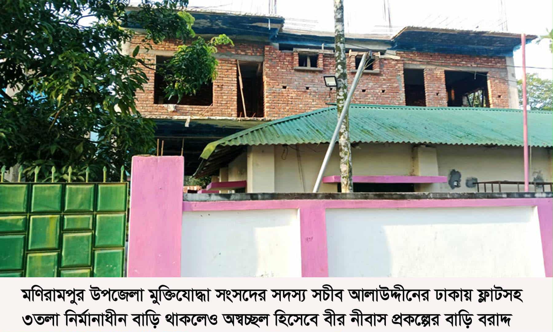 মণিরামপুর উপজেলা মুক্তিযোদ্ধা সংসদের সদস্য সচীব আলাউদ্দীনের ঢাকায় ফ্লাটসহ ৩ তলা নির্মানাধীন বাড়ি থাকলেও অস্বচ্ছল হিসেবে বীর নীবাস প্রকল্পের বাড়ি বরাদের অভিযোগ