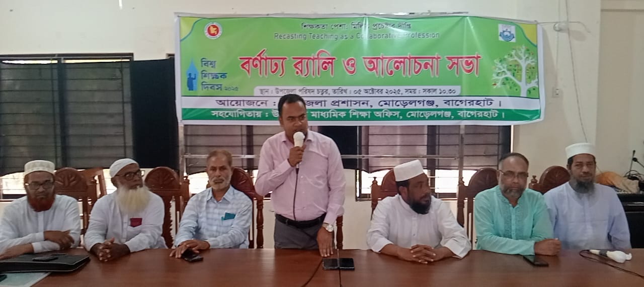 "শিক্ষকতা পেশা মিলিত প্রচেষ্টার দীপ্তি"প্রতিপাদ্য বিষয় নিয়ে বাগেরহাটের মোরেলগঞ্জে বিশ্ব শিক্ষক দিবস-২০২৫ উদযাপন উপলক্ষে র্যালি আলোচনা সভা অনুষ্ঠিত হয়েছে।