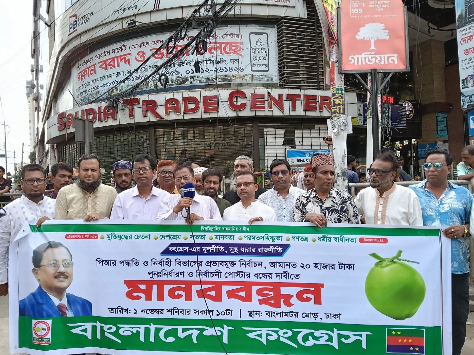 পিআর পদ্ধতি ও নির্বাহী বিভাগের প্রভাবমুক্ত নির্বাচন এবং জাতীয় সংসদ নির্বাচনে জামানত ২০ (বিশ) হাজার টাকা পুনঃনির্ধারণ ও পোস্টার নিষিদ্ধ করার দাবীতে মানববন্ধন করেছে বাংলাদেশ কংগ্রেস। আজ ১ নভেম্বরর শনিবার সকাল ১১টায় বাংলামটর মোড়ে অনুষ্ঠিত মানববন্ধনে বাংলাদেশ কংগ্রেসের চেয়ারম্যান এ্যাডঃ কাজী রেজাউল হোসেন বলেন, স্বৈরাচারের পতনের পর দেশবাসী আশা করেছিল দেশে স্থিতিশীলতা ফিরে আসবে, শান্তি ফিরে আসবে, নির্বাচন ব্যবস্থার সংষ্কারের মাধ্যমে দেশে সুন্দর নির্বাচনী পরিবেশ সৃষ্টি হবে। কিন্তু অন্তর্বর্তীকালিন সরকার দেশবাসীকে চরমভাবে হতাশ করেছে। চারিদিকে চাঁদাবাজি, দখলবাজি, একের পর এক অগ্নিকান্ড, একের পর এক শিল্প-কারখানা বন্ধ হওয়া, দেশী-বিদেশী বিনিয়োগ বন্ধ হওয়া, আইন-শৃংখলা বাহিনীর চরম অবনতি-সব মিলিয়ে দেশবাসী আজ অতিষ্ঠ।