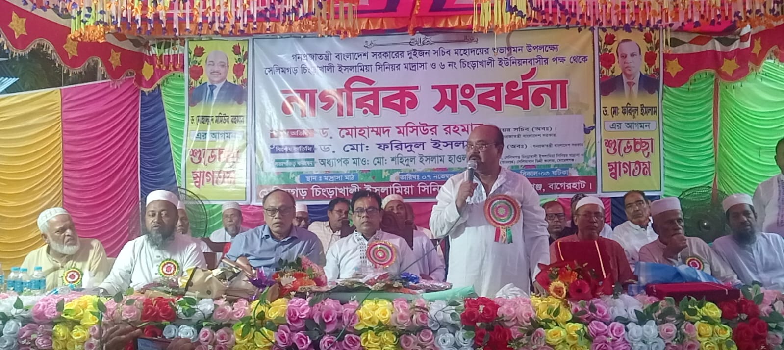 বাগেরহাটের মোরেলগঞ্জ উপজেলার সেলিমগড় চিংড়াখালী ইসলামিয়া সিনিয়র মাদ্রাসা ও ৬নং চিংড়াখালী ইউনিয়নবাসীর যৌথ উদ্যোগে গনপ্রজাতন্ত্রী বাংলাদেশ সরকারের দুইজন অবসরপ্রাপ্ত সচিবকে নাগরিক সংবর্ধনা প্রদান করা হয়। শুক্রবার ( ৭ নভেম্বর ২০২৫) বিকাল ৩ ঘটিকায় মাদ্রাসা প্রাঙ্গণে এক বর্ণাঢ্য অনুষ্ঠানের আয়োজন করা হয়।