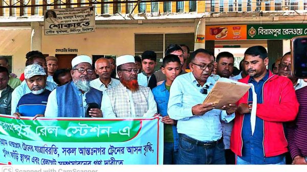 এমডি রেজওয়ান আলী বিরামপুর (দিনাজপুর) প্রতিনিধি-দিনাজপুরের বিরামপুর রেল স্টেশনে পঞ্চগড় ও কুড়িগ্রাম এক্সপ্রেস ট্রেনের যাত্রাবিরতি,সকল আন্তঃনগর ট্রেনে আসন সংখ্যা বৃদ্ধি,রেলস্টেশনে পুলিশ ফাঁড়ি স্থাপন এবং রেলগেট সম্প্রসারণের দাবিতে মানববন্ধন ও