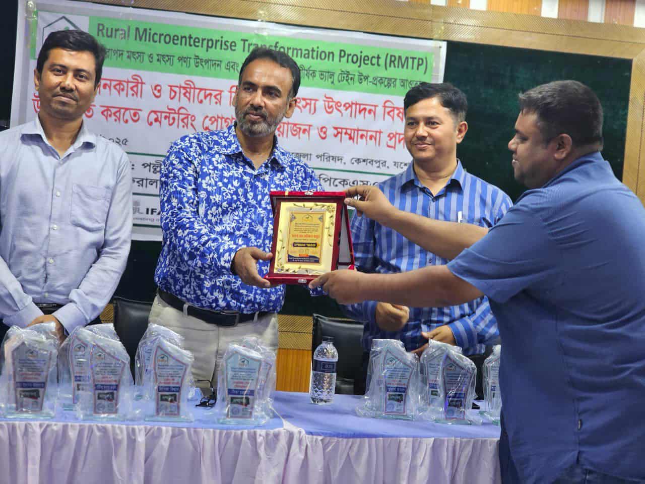 আর্থিক ও কারিগরি সহায়তায়ঃ পল্লী কর্ম-সহায়ক ফাউন্ডেশন (পিকেএসএফ) এর "সেবা প্রদানকারী ও চাষীদের নিরাপদ মৎস্য উৎপাদন বিষয়ে উৎসাহিত করতে মেন্টরিং প্রোগ্রাম আয়োজন ও সম্মাননা প্রদান'' করেছেন। উক্ত মেন্টরিং প্রোগ্রামে প্রধান অতিথি হিসাবে উপস্থিত ছিলেন মনিরুল মামুন, জেলা মৎস্য অফিসার, যশোর, মেন্টর হিসাবে ছিলেন সুদীপ বিশ্বাস, সিনিয়র উপজেলা মৎস্য অফিসার, কেশবপুর, আমন্ত্রিত অতিথি হিসাবে ছিলেন সেলিম রেজা, সিনিয়র উপজেলা মৎস্য অফিসার, মনিরামপুর এবং লিপটন সরদার, সিনিয়র উপজেলা মৎস্য অফিসার, অভয়নগর । উক্ত মেন্টরিং প্রোগ্রামে সফল উদ্যোক্তা হিসাবে উপস্থিত ছিলেন কেশবপুর উপজেলার আরএমটিপি প্রকল্পের ৩০জন মৎস্য চাষী, সেবাপ্রদানকারী এবং ক্ষুদ্র উদ্যোক্তাগন । বিভিন্ন মৎস্য চাষীদের মৎস্য চাষের বিভিন্ন অভিজ্ঞতার বিষয়ে আলোচনা করা হয় এবং সবাইকে সম্মাননার জন্য ক্রেস্ট বিতরণ করা হয়। এছাড়াও উক্ত প্রশিক্ষনে উপস্থিত ছিলেন আরএমটিপি প্রকল্পের ভ্যালু চেইন ফ্যাসিলিটেটর হাসান উজ্জামান, পিএমডিও। মনিরুজ্জামান সহ আরএমটিপি প্রকল্পের অন্যান্য স্টাফবৃন্দ।