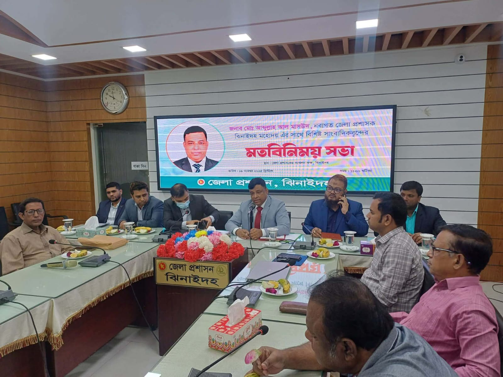ঝিনাইদহে নবাগত জেলা প্রশাসকের সাথে বিভিন্ন প্রিন্ট ও ইলেকট্রনিক মিডিয়ায় কর্মরত সাংবাদিকদের এক মতবিনিময় সভা অনুষ্ঠিত হয়েছে। বুধবার (১৯ নভেম্বর) সকালে জেলা প্রশাসকের সম্মেলন কক্ষে অতিরিক্ত জেলা প্রশাসক সাইফুর রহমানের সভাপতিত্বে অনুষ্ঠিত সভায় প্রধান অতিথি ছিলেন জেলা প্রশাসক আব্দুল্লাহ আল মাসউদ। বিশেষ অতিথি ছিলেন জেলা পরিষদের প্রধান নির্বাহী কর্মকর্তা সেলিম রেজা পিএএ, স্থানীয় সরকার বিভাগের উপ-পরিচালক রথীন্দ্রনাথ রায়।, জেলা তথ্য অফিসার আব্দুর রউফ এর পরিচালনায় মত বিনিময় সভায় বক্তব্য রাখেন ঝিনাইদহ জেলা রিপোর্টার্স ইউনিটির সভাপতি এম এ কবীর, ঝিনাইদহ প্রেসক্লাবের সভাপতি আসিফ কাজল, জেলা প্রেস ক্লাবের সভাপতি মিজানুর রহমান, আলাউদ্দিন আজাদ, মাহমুদ হাসান টিপু, সাদ্দাম হোসেন প্রমুখ।