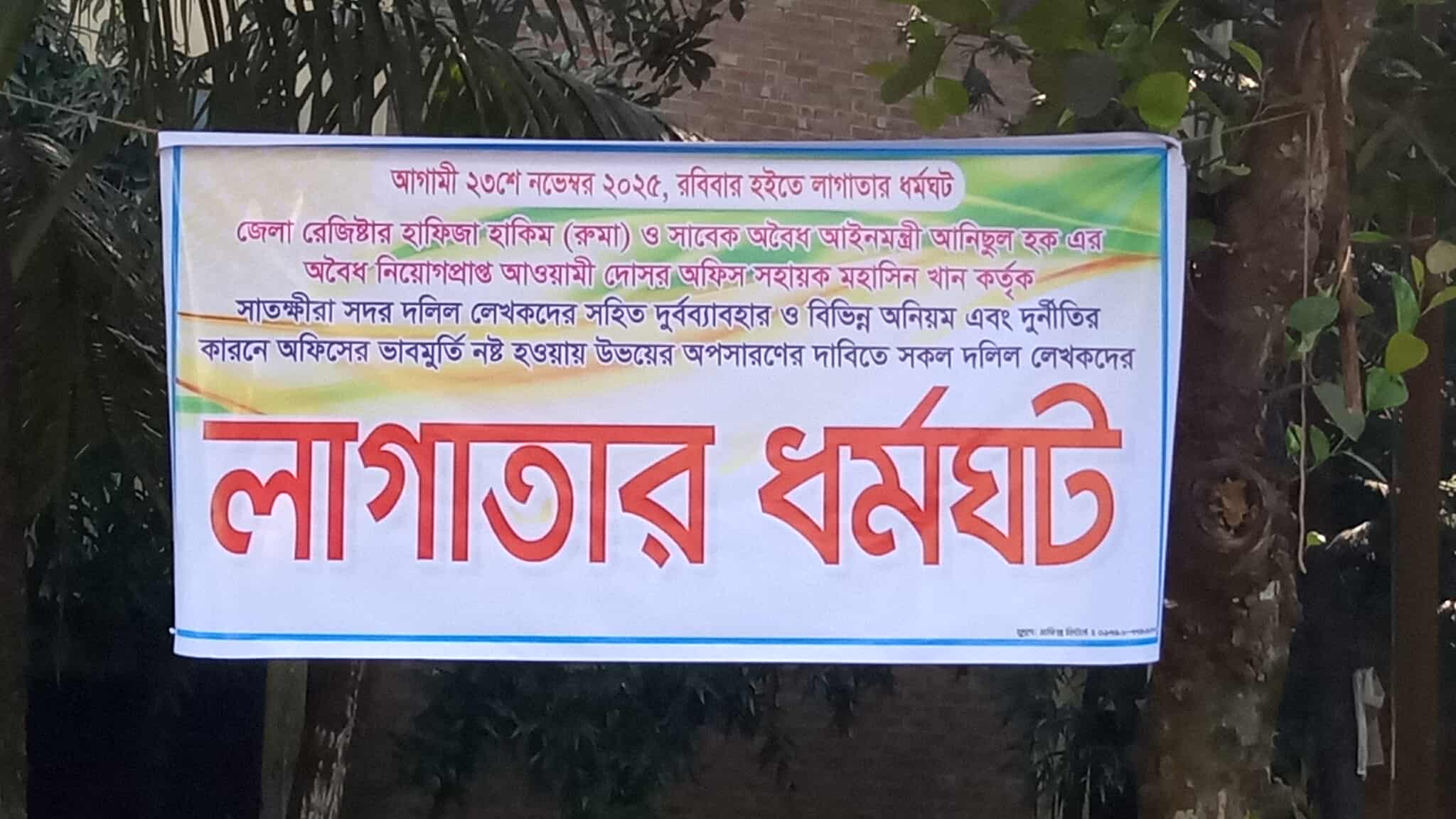 উল্লেখ্য, সাতক্ষীরা সদর রেজিষ্ট্রি অফিসের অফিস সহায়ক দুর্ণীতিবাজ মহাসিন খান ফ্যাসিষ্ট সরকারের সাবেক আইনমন্ত্রী আনিসুল হকের ভাইপো পরিচয় দিয়ে দীর্ঘদিন রাজত্ব চালিয়েছেন। তার বাড়ি ফ্যাসিষ্ট সরকারের সাবেক আইনমন্ত্রী আনিসুল হকের ব্রাহ্মণবাড়িয়া জেলার একই এলাকায়। তার তদবিরেই মহাসিনের চাকরি হয় সেই দাপটে অফিস স্টাফদের সাথে খারাপ আচারণ করে আসছে প্রতিনিয়ত। দলিল লেখক সমিতির একাধিক কর্মকতারা তার বিরুদ্ধে একাধিকবার অভিযোগ দিয়েছে সদর সাব-রেজিষ্ট্রারের কাছে কিন্তু কোন সামাধান করেনি। এই অফিস সহায়ক মহাসিন খান বদলি না হওয়া পর্যন্ত দলিল লেখকেরা ২৩ নভেম্বর থেকে লাগাতার ধর্মঘটের ডাক দিয়েছে।
