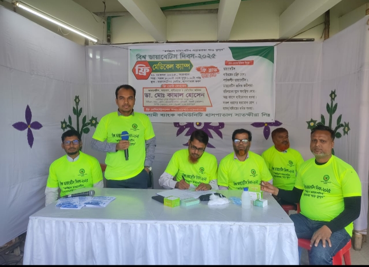 আন্তর্জাতিক ডায়াবেটিস দিবস উপলক্ষে ইসলামী ব্যাংক কমিউনিটি হাসপাতাল সাতক্ষীরা লিমিটেড এর আয়োজন ফ্রি ডায়াবেটিস, থাইরয়েড, হরমোন ও মেডিসিন রোগী দেখা মেডিকেল ক্যাম্প অনুষ্ঠিত হয়েছে।শুক্রবার (২১ নভেম্বর) সকালে
