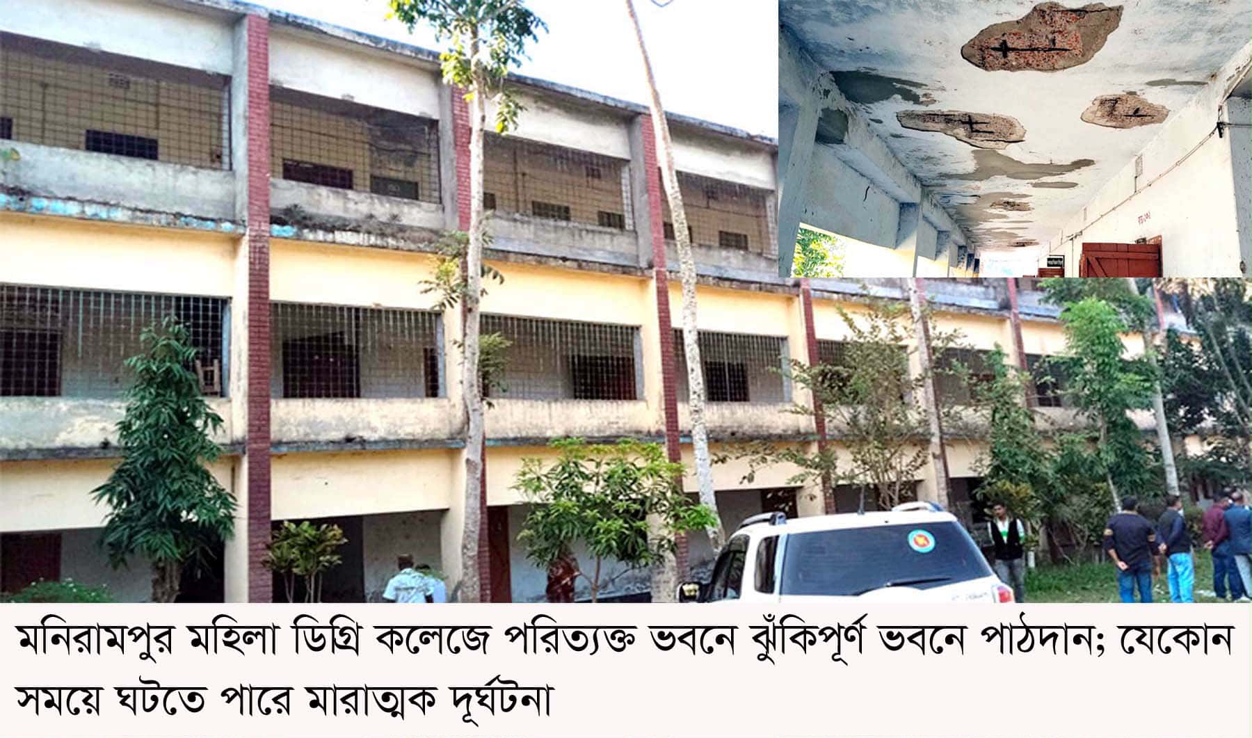 মনিরামপুর মহিলা ডিগ্রি কলেজে প্রয়োজনীয় সংখ্যক কক্ষ না থাকায় বাধ্য হয়েই তিনতলা পরিত্যক্ত ভাঙ্গাচুরা ভবনে জিবনের ঝুকি নিয়ে ছাত্রীদের পাঠদান করা হচ্ছে। শুধু তাই নয়, এ ভবনের তিনতলায় এখনও চালু রয়েছে ছাত্রী নিবাস। ফলে যেকোন মুহুর্তে অনাকাঙ্খিত ঘটনার আশঙ্কা দেখা দিয়েছে। তবে কর্তৃপক্ষ বলছেন আমরা আপ্রান চেষ্টা করছি পরিত্যক্ত ভবনে পাঠদান বন্ধ করে ছাত্রী নিবাস থেকে ছাত্রীদের সরিয়ে অন্য কোথায় অস্থায়ীভাবে পুনর্বাসনের। কিন্তু অর্থাভাবে সেটিও দ্রæত বাস্তবায়ন করা দুরুহ হয়ে পড়েছে। তার ওপর কক্ষের অভাবে আগামি এইচএসসি পরীক্ষা নেওয়া চ্যালেঞ্জের মুখে পড়েছেন কলেজ কর্তৃপক্ষ।
