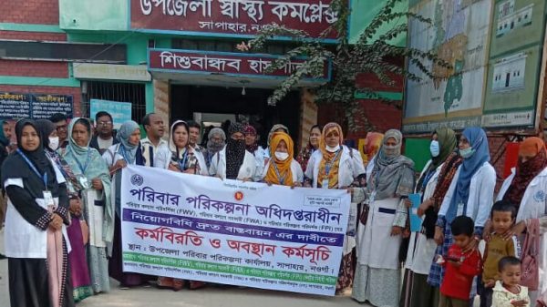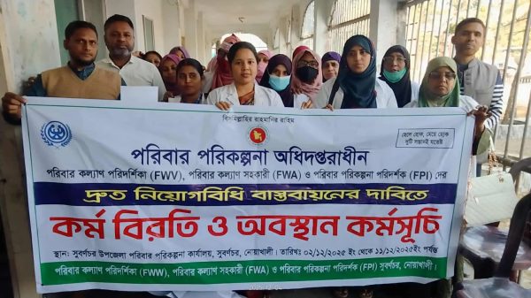হারুনুর রশিদ,সাপাহার(নওগাঁ) প্রতিনিধিঃপরিবার পরিকল্পনা অধিদপ্তরাধীন পরিবার কল্যাণ পরিদর্শিকা (FWV), পরিবার কল্যাণ সহকারী (FWA) ও পরিবার পরিকল্পনা পরিদর্শক (FPI) পদের নিয়োগবিধি দ্রুত বাস্তবায়নসহ বিভিন্ন দাবিতে নওগাঁর সাপাহারে কর্মবিরতি ও অবস্থান