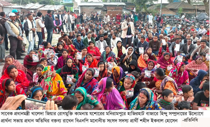 বিএনপির চেয়ারপার্সন সাবেক প্রধানমন্ত্রী দেশনেত্রী বেগম খালেদা জিয়ার দ্রæত রোগমুক্তি কামনা করে হিন্দু সম্প্রদায়ের হাজারো মানুষের অংশগ্রহনে প্রার্থনা সভা অনুষ্ঠিত হয়েছে। মণিরমাপুর উপজেলার হাজিরহাট বাজারে শুক্রবার বিকেলে হিন্দু সম্প্রদায়ের উদ্যোগে আয়োজিত প্রার্থনা সভায় প্রধান অতিথির বক্তব্য রাখেন বিএনপির মনোনীত ধানের শীষের প্রার্থী অ্যাড.শহীদ ইকবাল হোসেন।
