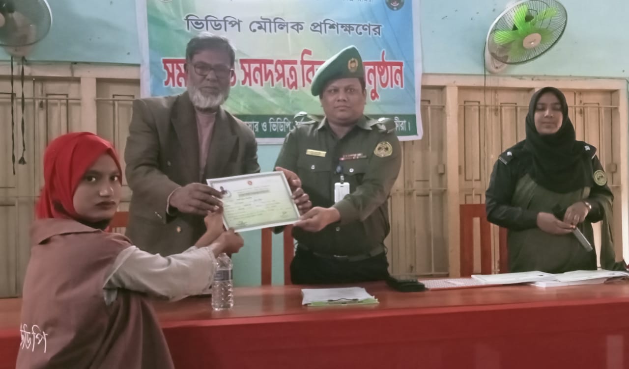 কলারোয়া (সাতক্ষীরা) প্রতিনিধি: কলারোয়ায় উপজেলা আনসার ভিডিপির উদ্যোগে ভিডিপি সদস্যদের ১০ দিনব্যাপী গ্রাম ভিত্তিক মৌলিক প্রশিক্ষণার্থী সদস্যদের মাঝে সনদ বিতরণ করা হয়েছে। বৃহস্পতিবার (১১ডিসেম্বন) সকালে উপজেলার হেলাতলা ইউনিয়ন পরিষদের হলরুমে ওই সনদ বিতরণ করা হয়। এতে প্রধান অতিথি হিসেবে উপস্থিত থেকে সনদ পত্র বিতরণ ও বক্তব্য দেন-জেলা আনসার ও ভিডিপির জেলা কমান্ড্যান্ট মো: আশরাফুজ্জামান (বিভিএমএস)। বিশেষ অতিথি হিসাবে উপস্থিত ছিলেন-উপজেলা নির্বাহী অফিসার জেবুন নাহার। এসময় উপস্থিত ছিলেন-হেলাতলা ইউনিয়ন পরিষদের চেয়ারম্যান মোয়াজ্জেম হোসেন, সচিব তাজীর আলম, কলারোয়া উপজেলা আনসার ভিডিপি অফিসার হালিমা খাতুনসহ কেলালকাতা ইউনিয়নের ২৪জন নারী ও ৪০জন পুরুষ প্রশিক্ষানার্থী। ১০ দিনব্যাপী প্রশিক্ষণের অংশ হিসেবে অগ্নিনিয়ন্ত্রণ বিষয়কসহ বিভিন্ন বিষয়ে প্রশিক্ষণ প্রদান করা হয়। প্রশিক্ষণ শেষ ৬৪ জন নারী-পুরুষের মাঝে সনদ বিতরণ করা হয়।