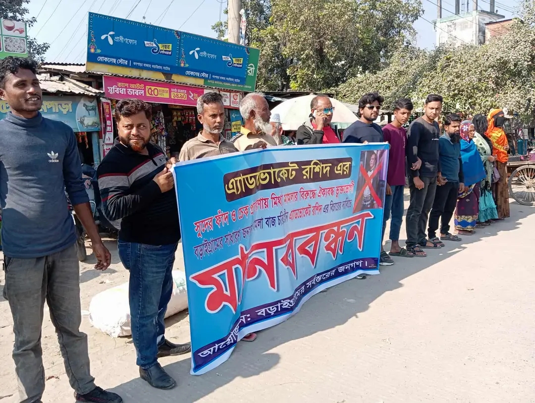 শনিবার (১৩ ডিসেম্বর) সকালে উপজেলার বনপাড়া পৌরসভার সামনে সুদের ফাঁদ ও চেক প্রতারণার মাধ্যমে সহজ-সরল মানুষকে ফাঁসিয়ে মিথ্যা ও হয়রানিমূলক মামলা দেওয়ার অভিযোগে আ: রশিদ নামের এক আইনজীবীর শাস্তির দাবিতে এই মানববন্ধন অনুষ্ঠিত হয়।