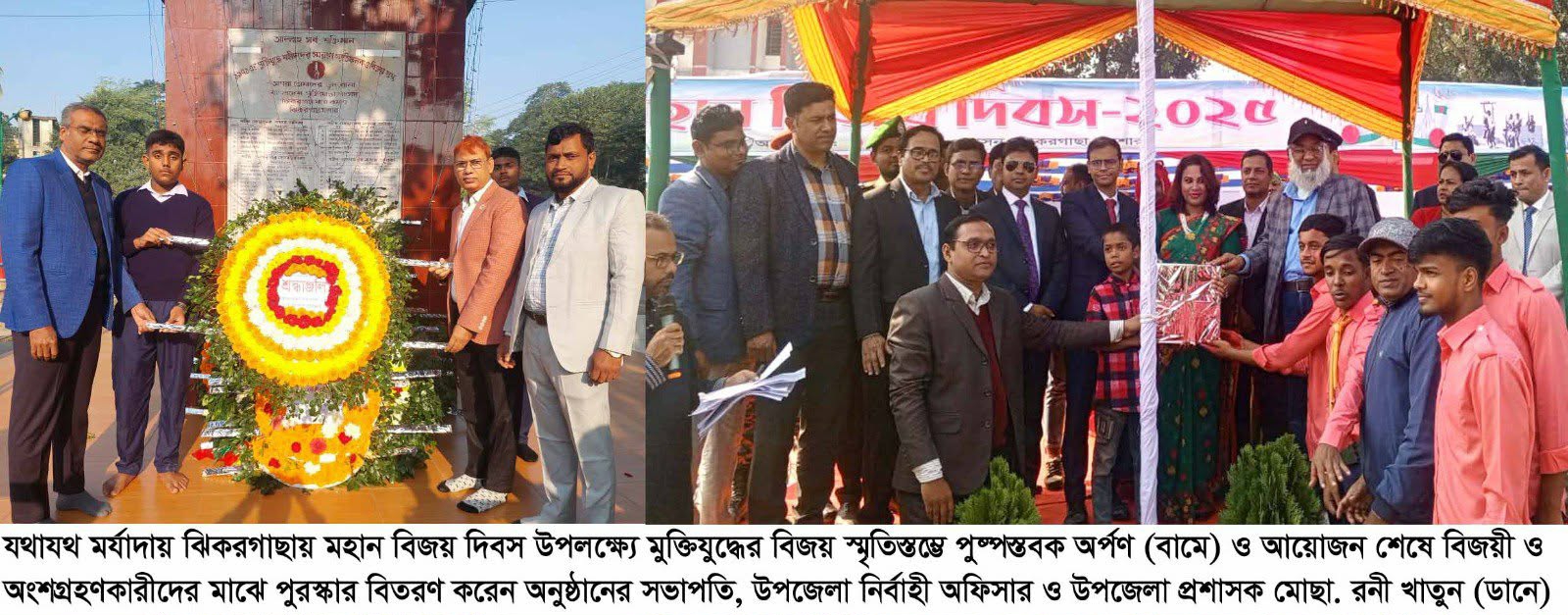 বিল্লাল হুসাইন।। ঝিকরগাছা উপজেলা প্রশাসনের আয়োজনে যথাযথ মর্যাদায় মহান বিজয় দিবস-২০২৫ উপলক্ষ্যে মুক্তিযুদ্ধের বিজয় স্মৃতিস্তম্ভে পুষ্পস্তবক অর্পণ, কুচকাওয়াজ, ডিসপ্লে ও বীর মুক্তিযোদ্ধাগণের সংবর্ধনা এবং চারুকারু ও স্থানীয়ভাবে উৎপাদিত পণ্যের সমারোহে বিজয়মেলা অনুষ্ঠিত হয়েছে। মঙ্গলবার(১৬ ডিসেম্বর) সকাল ৮টা উপজেলা প্রশাসনের আযোজনে উপজেলার মোড়ের মুক্তিযুদ্ধের বিজয় স্মৃতিস্তম্ভে পুষ্পস্তবক অর্পণ করেন উপজেলা প্রশাসন, থানার প্রশাসন, পৌর কার্যালয়, ঝিকরগাছা সরকারি বহুমুখী মডেল (এমএল) হাই স্কুল, সামাদ মেমোরিয়াল চাইল্ড লার্নিং হোমসসহ অন্যান্য সরকারি-বেসরকারি প্রতিষ্ঠান। এরপর স্থানীয় বিএম হাই স্কুল মাঠ চত্ত্বরে বিজয় দিবস উপলক্ষে বিজয় মেলার শুভ উদ্বোধন করতে জাতীয় পতাকা উত্তোলন, বেলুন ও শ্বেতপায়রা উড়িয়ে দেন উপজেলা নির্বাহী অফিসার ও উপজেলা প্রশাসক মোছা. রনী খাতুন। তিনি অনুষ্ঠানে সভাপতির বক্তব্যে মহান বিজয় দিবসের বিষয়ে স্বাধীনতা সংগ্রামে আত্মোৎসর্গকারী বীর শহীদদের আত্মত্যাগের কথা গভীর শ্রদ্ধায় স্মরণ করেন ও মুক্তিযুদ্ধের তাৎপর্য তুলে ধরে বলেন, আজ বাঙ্গালী জাতির অন্যান্য গৌরবোজ্জ্বল দিন। দীর্ঘ নয় মাসের রক্তক্ষয়ী মুক্তিযুদ্ধের মাধ্যমে ১৯৭১ সালের এই দিনে ক্লান্ত বিজয় অর্জন করে। মহান মুক্তিযুদ্ধের ৩০লক্ষ শহীদ ও দুই লক্ষ সমভ্রমহারা মা-বোনসহ সকল মুক্তিযোদ্ধাদের যাদের আত্মত্যাগের বিনিময়ে আমরা পেয়েছি লাল সবুজের পতাকা। আজকের এই বিজয়ের ৫৪ বছর পূর্তিতে ঐতিহাসিক এই লগ্নে আমি ঝিকরগাছাবাসী সহ সকলকে জানাই বিজয় দিবসের আন্তরিক শুভেচ্ছা ও অভিনন্দন। এসময় উপস্থিত ছিলেন, উপজেলা মুক্তিযোদ্ধা কমান্ডার বীর মুক্তিযোদ্ধা রফিকুল ইসলাম, সহকারী কমিশনার (ভূমি) ও পৌর প্রশাসক নাভিদ সারওয়ার, সহকারী পুলিশ সুপার, নাভারন সার্কেল মো. আরিফ হোসেন, থানার অফিসার ইনচার্জ মো. শাহজালাল আলম, উপজেলা স্বাস্থ্য ও পরিবার পরিকল্পনা অফিসার ডা. আব্দুর রশিদ, উপজেলা কৃষি অফিসার কৃষিবিদ নুরুল ইসলাম, উপজেলা প্রাণিসম্পদ অফিসার ডা. মাসুমা আখতার, উপজেলা প্রকৌশলী অফিসার সাইফুল ইসলাম মোল্লা, উপজেলা প্রাথমিক শিক্ষা অফিসার ওলিয়ার রহমান, উপজেলা মাধ্যমিক শিক্ষা অফিসার এস এম সুলতান আহমেদ, উপজেলা যুব উন্নয়ন অফিসার তোফাজ্জল হোসেন, ঝিকরগাছা সরকারি বহুমুখী (এমএল) মডেল হাই স্কুলের প্রধান শিক্ষক মোস্তাফিজুর রহমান আজাদ, বিএম হাই স্কুলের প্রধান শিক্ষক আব্দুস সামাদ, সামাদ মেমোরিয়াল চাইল্ড লার্নিং হোমসের অধ্যক্ষ মাসুমা মিম, ঝিকরগাছা মাল্টিমিডিয়া ডট কম সার্ভিসের পরিচালক আফজাল হোসেন চাঁদ, উপজেলার ছাত্র প্রতিনিধি আখি থাতুন, মুক্তিযোদ্ধা সংসদ, উপজেলা ও পৌর বিএ