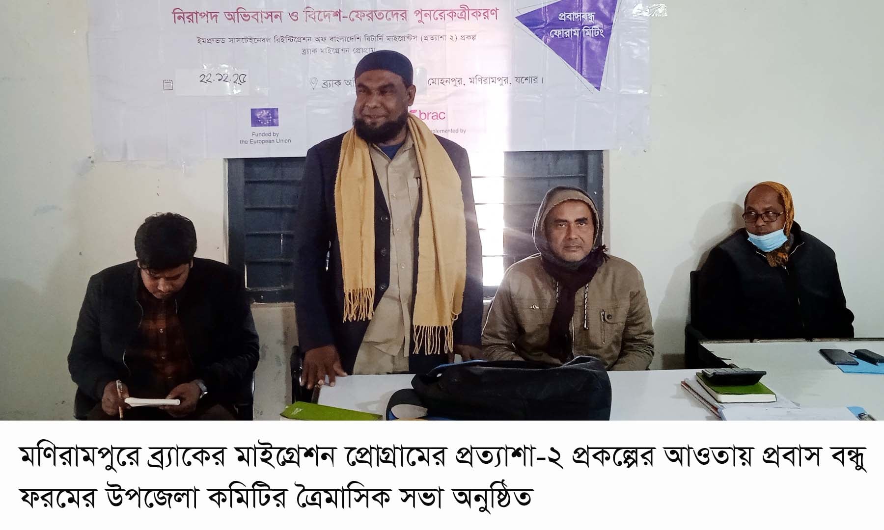 মণিরামপুরে ব্র্যাকের মাইগ্রেশন প্রোগ্রামের প্রত্যাশা-২ প্রকল্পের আওতায় প্রবাস বন্ধু ফরমের উপজেলা কমিটির ত্রৈমাসিক সভা অনুষ্ঠিত হয়েছে। উপজেলা প্রবাস বন্ধু ফরমের সভাপতি সহকারী অধ্যাপক নূরুল হকের সভাপতিত্বে সোমবার দুপুর ১২ টায় পৌরশহরের ব্র্যাকের আঞ্চলিক কার্যালয়ের হল রুমে অনুষ্ঠিত এ সভায় প্রধান অতিথির বক্তব্য রাখেন ব্র্যাকের যশোর জেলা এমআরএসসি কোঅর্ডিনেটর রবিউল ইসলাম রুবেল।