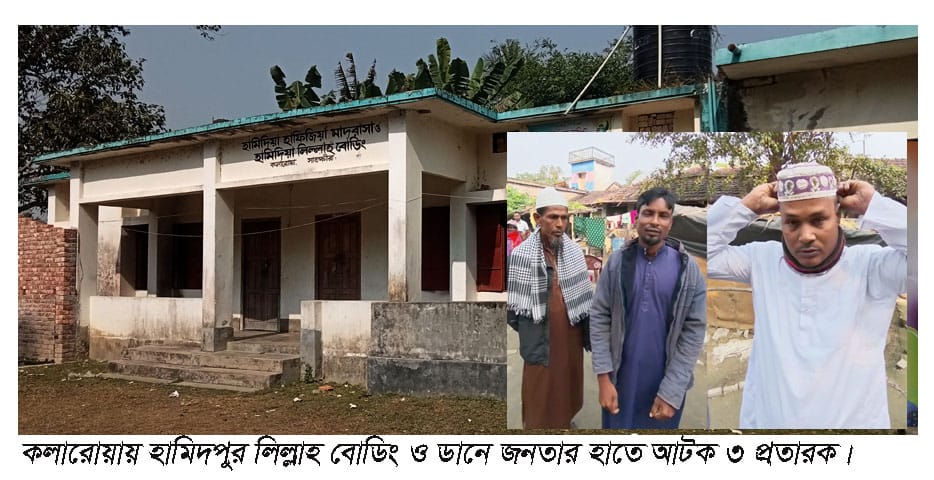 কলারোয়া (সাতক্ষীরা) প্রতিনিধি: কলারোয়ায় দক্ষিণবঙ্গের ঐতিহ্য হামিদপুরের সুনাম নষ্ট করতে একটি চক্র রসিদ ছাপিয়ে টাকা তুলছে বলে অভিযোগ উঠেছে। আর এই টাকা তুলতে গিয়ে এলাবাসীর হাতে ৩জন আটক হয়ে গণধোলাই শিকার হয়েছে। এর পর ফাস হয়ে পড়েছে ওই চক্রটি কলারোয়া উপজেলার হামিদপুরে দীঘদিন বন্ধ থাকা আমিনীয়া লিল্লাহ বোডিং এর নামে রসিদ ছাপিয়ে জেলা ব্যাপী চষে বেড়াচ্ছে। এমনকি তারা লুটে নিচ্ছে লক্ষ লক্ষ টাকা। আর এই অভিযোগ তুলে হামিদপুর ছোট পীর ওলিউল্লাহ হামিদী বলেন, তার-বাপ দাদার ঐতিহ্য হামিদপুর পীর সাহেব এর দরবার শরিফ। দক্ষিণবঙ্গের ঐতিহ্যবাহী একটি প্রতিষ্ঠান আর এই প্রতিষ্ঠানের সুনাম নষ্ট করার জন্য একটি চক্র দীঘদিন ধরে এই অপকর্ম করে যাচ্ছে। যা সম্প্রতি উপজেলার মুরারীকাটি গ্রামের মো: রাসেল, কাজী মাসুদ ও ঝিকরা-গদখালীর মাসুদ নামের ৩ ব্যক্তি উপজেলার চন্দনপুর ইউনিয়নে চাঁদা নিতে গিয়ে ধরা পড়ার পরে প্রকাশ পেয়েছে। তিনি আরো বলেন-হামিদপুর আমিনীয়া লিল্লাহ বোডিং নামে একটি প্রতিষ্ঠান ছিলো। শিক্ষার্থী না থাকায় প্রতিষ্ঠানটি দীঘদিন যাবত বন্ধ রয়েছে। এই বন্ধ প্রতিষ্ঠানের নামে টাকা তোলার প্রশ্নই আসেনা। আর এই কাজের সাথে যারা জড়িত তাদের বিরুদ্ধে আইনে ব্যবস্থা নেয়ার প্রয়োজন বলে তিনি মনে করেন। অন্যদিকে উপজেলার হামিদপুর সিদ্দিকীয়া ফাজিল (স্নাতক) মাদ্রসার অধ্যক্ষ মুজিবর রহমান স্বাক্ষরিত একটি পরিচয় পত্রে দেখা গেছে, উপজেলার পাঁচনল গ্রামের পীর বকসের ছেলে আজিবার সরদারকে মাদ্রাসার লিল্লাহী বোডিং এর গরীব ছাত্রদের খাওয়া ও তাদের কিতাবপত্রদি ক্রয় করার জন্য বিভিন্ন এলাকা থেকে দান গ্রহণের জন্য একটি অনুমতি পত্র দেয়া হয়েছে। এবিষয়ে মাদ্রাসার অধ্যক্ষ মুজিবর রহমান বলেন-তিনি হামিদপুর লিল্লাহ বোডিং এর নামে বর্তমানে টাকা তোলার জন্য কাউকে অনুমতি দেননি। তার লিল্লাহ বোডিং বন্ধ রয়েছে। তিনি এ কাজে জড়িত ব্যক্তিদের শাস্তি কামনা করেন।