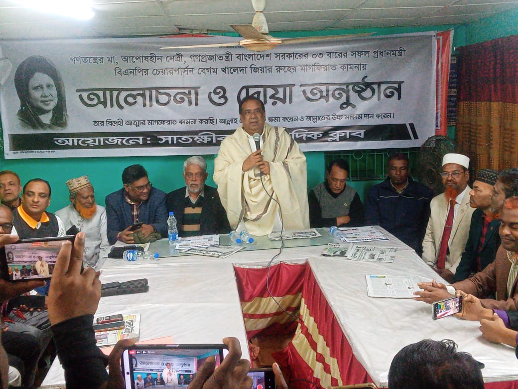 সাতক্ষীরা শহরে সাবেক প্রধানমন্ত্রী ও বিএনপি চেয়ারপারসন বেগম খালেদা জিয়ার রুহের মাগফেরাত কামনায় দোয়া মাহফিল করেছে সাতক্ষীরা সাংবাদিক ক্লাব। মঙ্গলবার সন্ধ্যায় শহরের পলাশপোল এলাকায় সংগঠনের অস্থায়ী কার্যালয়ে এই অনুষ্ঠানের আয়োজন করা হয়। সাতক্ষীরা সাংবাদিক ক্লাবের সভাপতি এসএম মহিদার রহমানের সভাপতিত্বে অনুষ্ঠানে প্রধান অতিথি ছিলেন জেলা বিএনপির আহ্বায়ক রহমতউল্লাহ পলাশ। অনুষ্ঠানে বিশেষ অতিথি হিসেবে উপস্থিত ছিলেন জেলা বিএনপির প্রতিষ্ঠাতা সাধারণ সম্পাদক কামরুল ইসলাম ফারুক, সাবেক সাধারণ সম্পাদক তারিকুল হাসান, জ্যেষ্ঠ যুগ্ম আহ্বায়ক আবুল হাসান হাদী ও পৌর বিএনপির সাবেক সভাপতি হাবিবুর রহমান হবি। সাধারণ সম্পাদক মীর আবু বকারের সঞ্চালনায় মাহফিলে জেলা বিএনপির সদস্য মাসুম বিল্লাহ শাহীন, প্রভাষক আতাউর রহমান, আবুল কালামসহ আদ্বুর রশিদ, মিহির উজ্জামান বাবু,মোঃ হাফিজ, ক্লাবের সদস্য ও দলীয় নেতা-কর্মীরা উপস্থিত ছিলেন। আলোচনা সভা শেষে মরহুমার আত্মার শান্তি কামনায় বিশেষ মোনাজাত করা হয়। প্রেসবিজ্ঞপ্তি