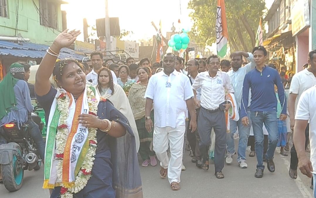 বাইজিদ মন্ডল দক্ষিন চব্বিশ পরগনা:-দক্ষিণ ২৪ পরগনার মগরাহাট ২ নম্বর ব্লকের মগরাহাট পূর্ব ও কলস গ্রাম পঞ্চায়েত এলাকায় জোরকদমে প্রচার সারল তৃণমূল কংগ্রেস। প্রায় ছয় কিলোমিটার রাস্তা জুড়ে ডোর-টু-ডোর প্রচারে অংশ নেন দলের প্রার্থী শর্মিষ্ঠা পুরকাইত এর সমর্থনে, ব্লক সহ-সভাপতি সেলিম লস্কর তত্ত্বাবধানে এই মিছিল। প্রচার চলাকালীন রাস্তার দু’ধারে উপচে পড়া ভিড় লক্ষ্য করা যায়। বহু মানুষ শঙ্খধ্বনি ও উলুধ্বনির মাধ্যমে প্রার্থীকে স্বাগত জানান, অনেকে আবার পা ছুঁয়ে প্রণাম করেন।