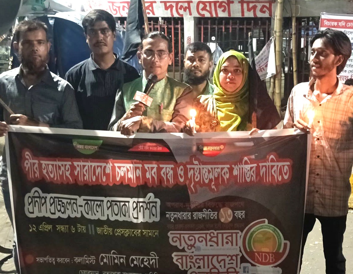 কুষ্টিয়ায় পীর হত্যাসহ চলমান মব বন্ধের দাবিতে প্রদীপ প্রজ্জলন ও কালো পতাকা প্রদর্শন এবং বিক্ষোভ সমাবেশ করেছে। নতুনধারা বাংলাদেশ এনডিবি। ১২ এপ্রিল রবিবার সন্ধ্যায় জাতীয় প্রেসক্লাবের সামনে নতুনধারার চেয়ারম্যান মোমিন মেহেদীর সভাপতিত্বে এতে বক্তব্য রাখেন প্রেসিডিয়াম মেম্বার বীর মুক্তিযোদ্ধা ফজলুল হক, সিনিয়র ভাইস চেয়ারম্যান শান্তা ফারজানা, ভাইস চেয়ারম্যান চন্দন সেনগুপ্ত, সাংগঠনিক সম্পাদক আল আমিন বৈরাগী প্রমুখ। এসময় মোমিন মেহেদী বলেন, নির্মম হলেও সত্য আজ জাতীয় জীবনের মানুষের দাম প্রতিনিয়ত কমছে, বাড়ছে চালের দাম- তেলের দাম, ডালের দামসহ নিত্য প্রয়োজনীয় দ্রব্যের দাম। শুধু এখানেই শেষ নয়; অন্তবর্তী সরকারের ১৮ মাসের মব-তথাকথিত তৌহিদী জনতা আর রাষ্ট্রিয় বিভিন্ন বাহিনীর পাশাপাশি সর্বোচ্চ নীতি-নির্ধারণী মহলে লুকিয়ে থাকা দেশ-স্বাধীনতা ও জনতা বিরোধীচক্রটি এখানো নির্মমতাকে উশকে দিচ্ছে। যে কারণে যেখানে সেখানে হামলা বন্ধ হয়নি, মিথ্যে মামলা বন্ধ হয়নি, ধর্ষণ কমেনি, থামেনি নির্মম হত্যাকাণ্ডও। এমতবস্থায় আমরা চাই কঠোর পদক্ষেপের মধ্য দিয়ে মববাজ-জামায়াত-শিবির-স্বাধীনতা বিরোধীদেরকে সরকার প্রতিহত করবে, বিচারের আওতায় আনবে এবং বাংলাদেশের মানুষকে সুরক্ষা দেয়ার ব্যবস্থা করবে। ভুলে যাবেন না, জুলাই বড় নয়; বড় বাংলাদেশের সাধারণ মানুষ। ‘জন সুরক্ষা আইন’ দেশের সর্বস্তরের মানুষের নিরাপত্তা নিশ্চিত করুন। আলাদা করে জুলাই সুরক্ষা আইন-এর মাধ্যমে মানুষের মধ্যে বৈষম্য সৃষ্টি করার মত ভুল সিদ্ধান্ত নিলে দেশের মানুষ তা মেনে নেবে না।